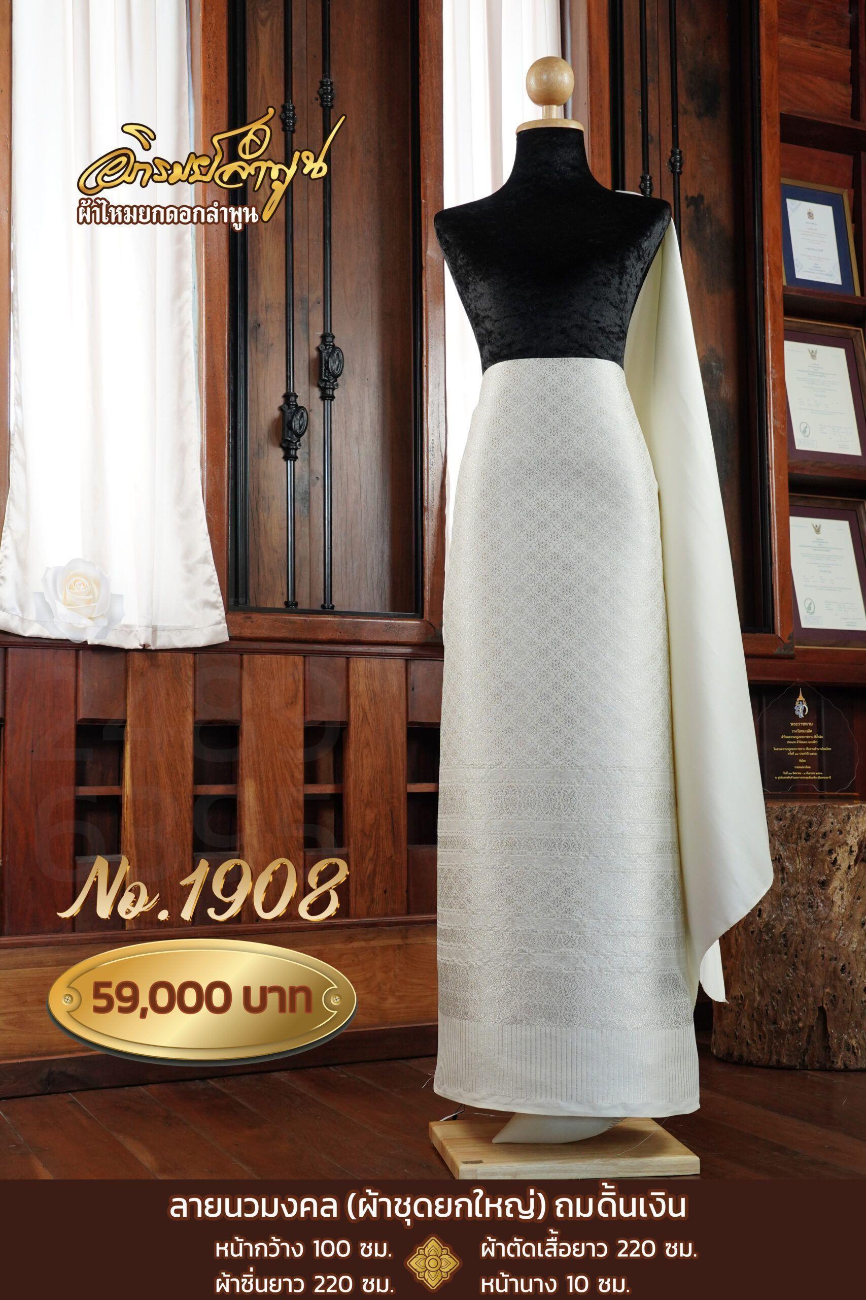 ผ้าชุดยกใหญ่ ลายนวมงคลถมดิ้นเงิน หน้ากว้าง100ซม. ผ้าตัดเสื้อยาว220ซม. ผ้าซิ่นยาว220ซม. หน้านาง10ซม.