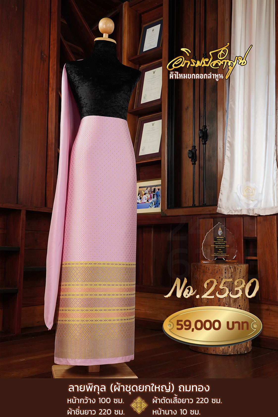 ผ้าชุดยกใหญ่ ลายพิกุลถมทอง หน้ากว้าง100ซม. ผ้าตัดเสื้อยาว220ซม. ผ้าซิ่นยาว220ซม. หน้านาง10ซม.