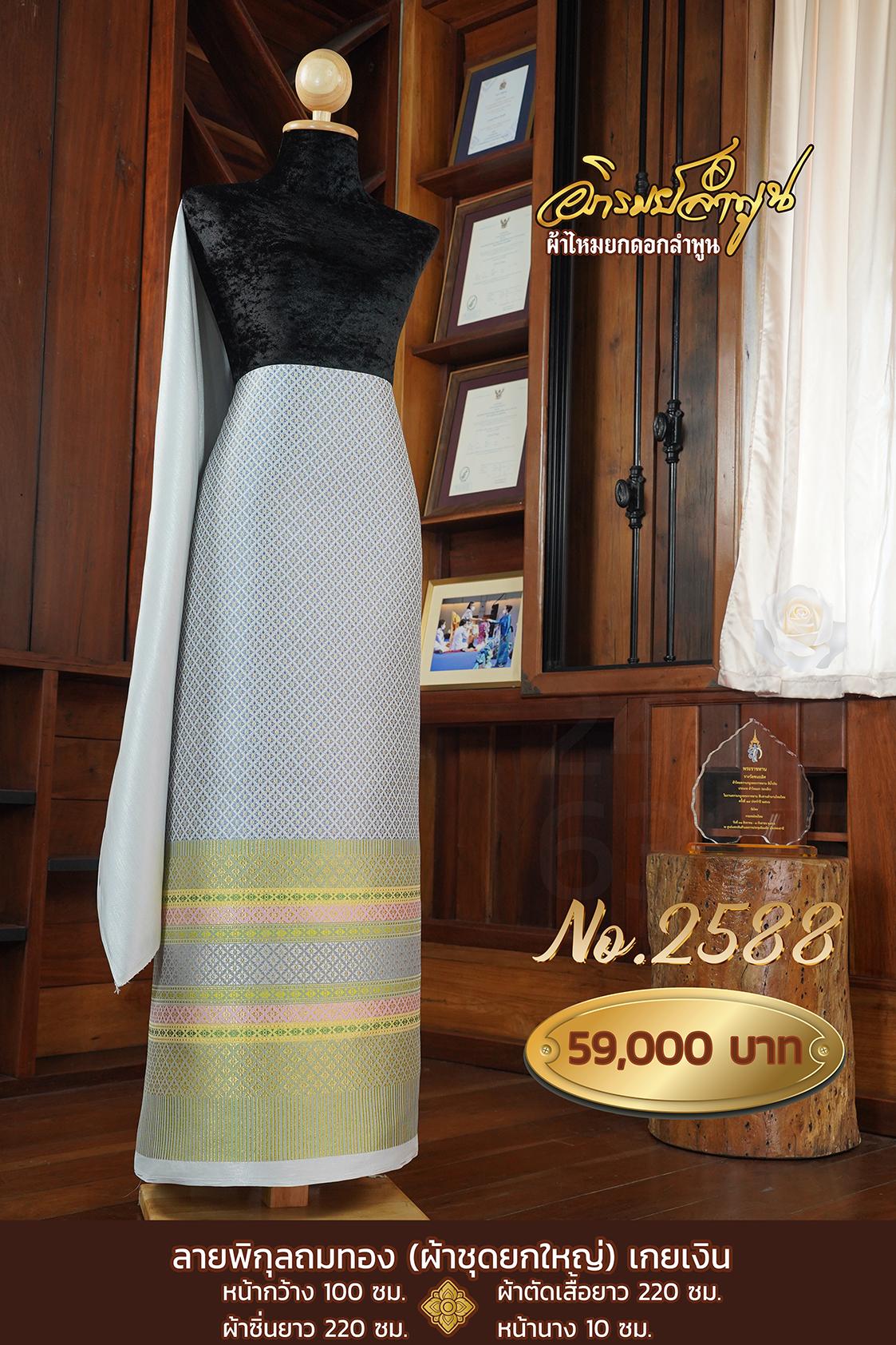 ผ้าชุดยกใหญ่ ลายพิกุลถมทองเกยเงิน หน้ากว้าง100ซม. ผ้าตัดเสื้อยาว220ซม. ผ้าซิ่นยาว220ซม. หน้านาง10ซม.