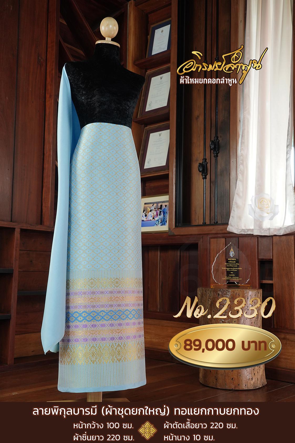 ผ้าชุดยกใหญ่ ลายพิกุลบารมีทอแยกกาบยกทอง หน้ากว้าง100ซม. ผ้าตัดเสื้อยาว220ซม. ผ้าซิ่นยาว220ซม. หน้านาง10ซม.