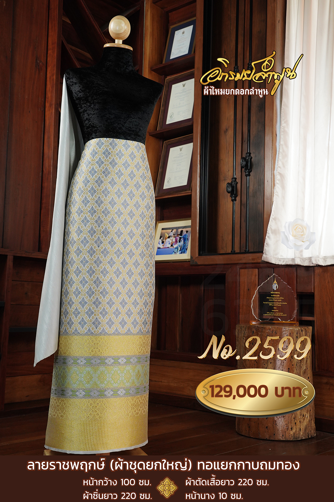 ผ้าชุดยกใหญ่ ลายราชพฤกษ์ทอแยกกาบถมทอง หน้ากว้าง100ซม. ผ้าตัดเสื้อยาว220ซม. ผ้าซิ่นยาว220ซม. หน้านาง10ซม.