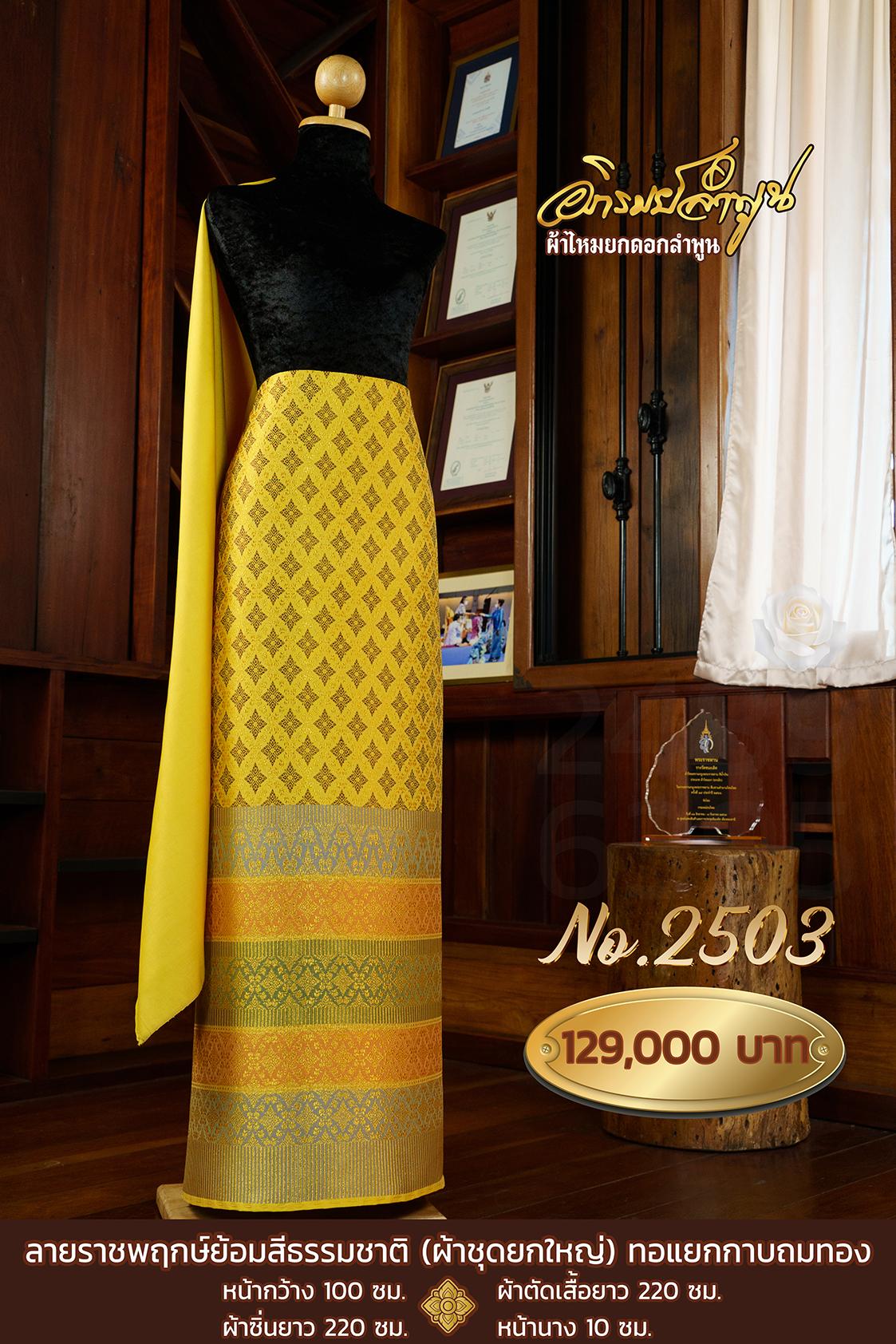ผ้าชุดยกใหญ่ ลายราชพฤกษ์(ทอแยกกาบถมทอง)ย้อมสีธรรมชาติด้วยมะพูด หน้ากว้าง100ซม. ผ้าตัดเสื้อยาว220ซม. ผ้าซิ่นยาว220ซม. หน้านาง10ซม.