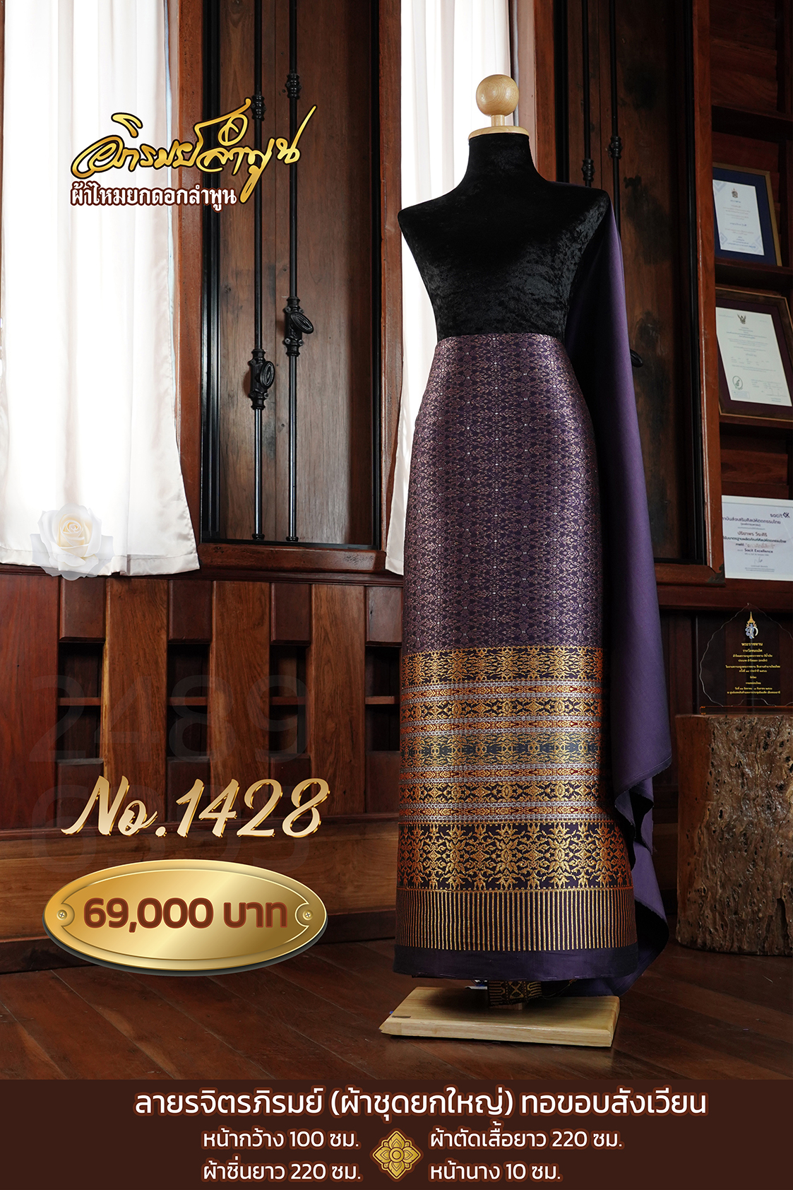ลายรจิตรภิรมย์ (ผ้าชุดยกใหญ่) ทอขอบสังเวียน หน้ากว้าง100ซม. ผ้าตัดเสื้อยาว220ซม. ผ้าซิ่นยาว220ซม. หน้านาง10ซม.